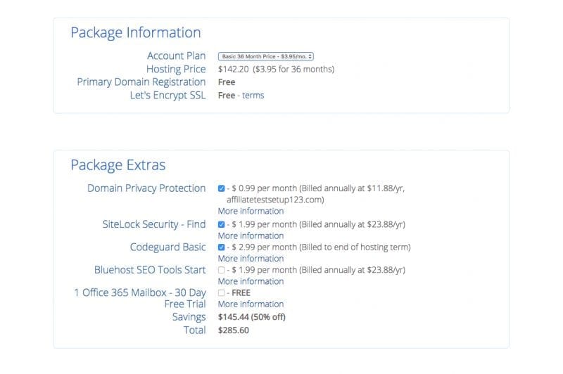While on the check out page you can select any extras you’d like to include with your hosting. I typically only include the domain privacy protection so as to keep my information private, which is only $.99/month.